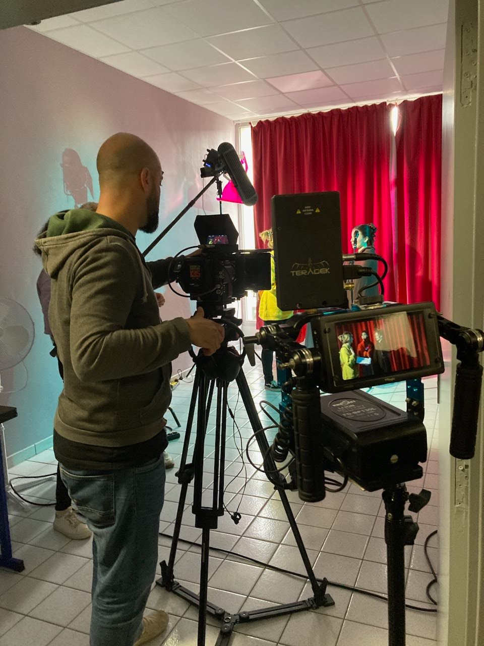 À Lomet, silence, on tourne ! Jeudi 2 avril, une journée spéciale de tournage a permis aux élèves de vivre une expérience au plus près des réalités d’un vrai plateau. Cette belle action s’inscrit dans la dynamique HMC portée au LPR Antoine Lomet. Grâce au BAT 47 et à une mobilisation collective forte, l’établissement s’est transformé en véritable lieu de tournage. Un moment à la fois intense, formateur et très inspirant. Les scènes retenues l’ont été en collaboration, pour leur intérêt pédagogique et leur proximité avec les exigences professionnelles : Mon père : une séquence sur le palier avec Linh, Jeanne et Nicole, puis une scène finale en extérieur avec Linh et Jeanne ; Son Altesse Protocole : une scène « pause pipi » des nains avec Wanda et Connie, puis une séquence finale de dialogue avec Goustan et Wanda ; Des jeunes filles enterrent leur vie : une scène au bord de la rivière avec trois personnages, puis un discours de début de soirée au micro avec Elsa et Clara ; Nous les prochains : un show drag avec Javel Habibi, puis des soins thanato avec Fred et Jean. Ces scènes ont permis de travailler dans des contextes variés — intérieur, extérieur, jour, nuit — avec des enjeux très concrets de continuité, de préparation des comédien·ne·s, de coordination des équipes et d’adaptation aux contraintes du tournage. Ce projet met aussi en lumière la richesse de la collaboration entre les trois champs HMC — DTMS costume, coiffure et esthétique — dans une dynamique de complémentarité, d’exigence et d’engagement. Une très belle réussite collective, au service des élèves et de la qualité des apprentissages.