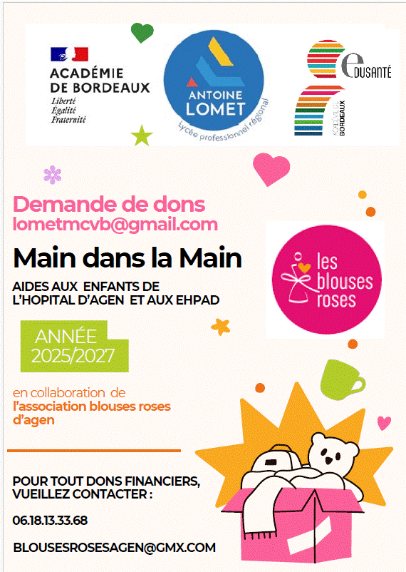 La classe de 1 MCVB s’engage pour une belle collecte de dons sur l’année 2026/2027, en partenariat avec Les Blouses Roses d’Agen – l’association qui égaye le quotidien des enfants de l’hôpital d’Agen et des résidents d’EHPAD grâce à ses bénévoles dynamiques et bienveillants. Nos élèves portent cet élan avec cœur : offrons-leur du réconfort, des jeux et de la joie dans ces moments fragiles ! Rejoignez-nous facilement : ✨ Dons financiers : appelez le 06 18 13 33 68 ou maillez blousesrosesagen@gmx.com ✨ Autres contributions : contactez-nous à lometmcvb@gmail.com Votre générosité illumine des vies ! 💖 Main dans la main, on met du rose partout