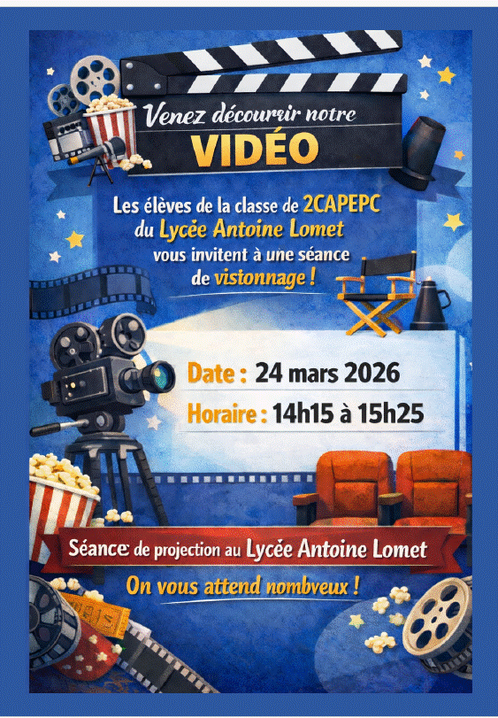 Les élèves de la classe de 2ᵉ CAP EPC du lycée Antoine-Lomet vous invitent à une séance de visionnage exclusive de leur vidéo. Date : mardi 24 mars 2026 Horaire : 14h15 à 15h25 Lieu : au lycée Antoine-Lomet, Agen Venez nombreux partager ce moment convivial et découvrir le talent de nos élèves ! Une belle occasion de plonger dans la vie de notre établissement Merci aux élèves et à Mme Clouet pour se temps de découverte